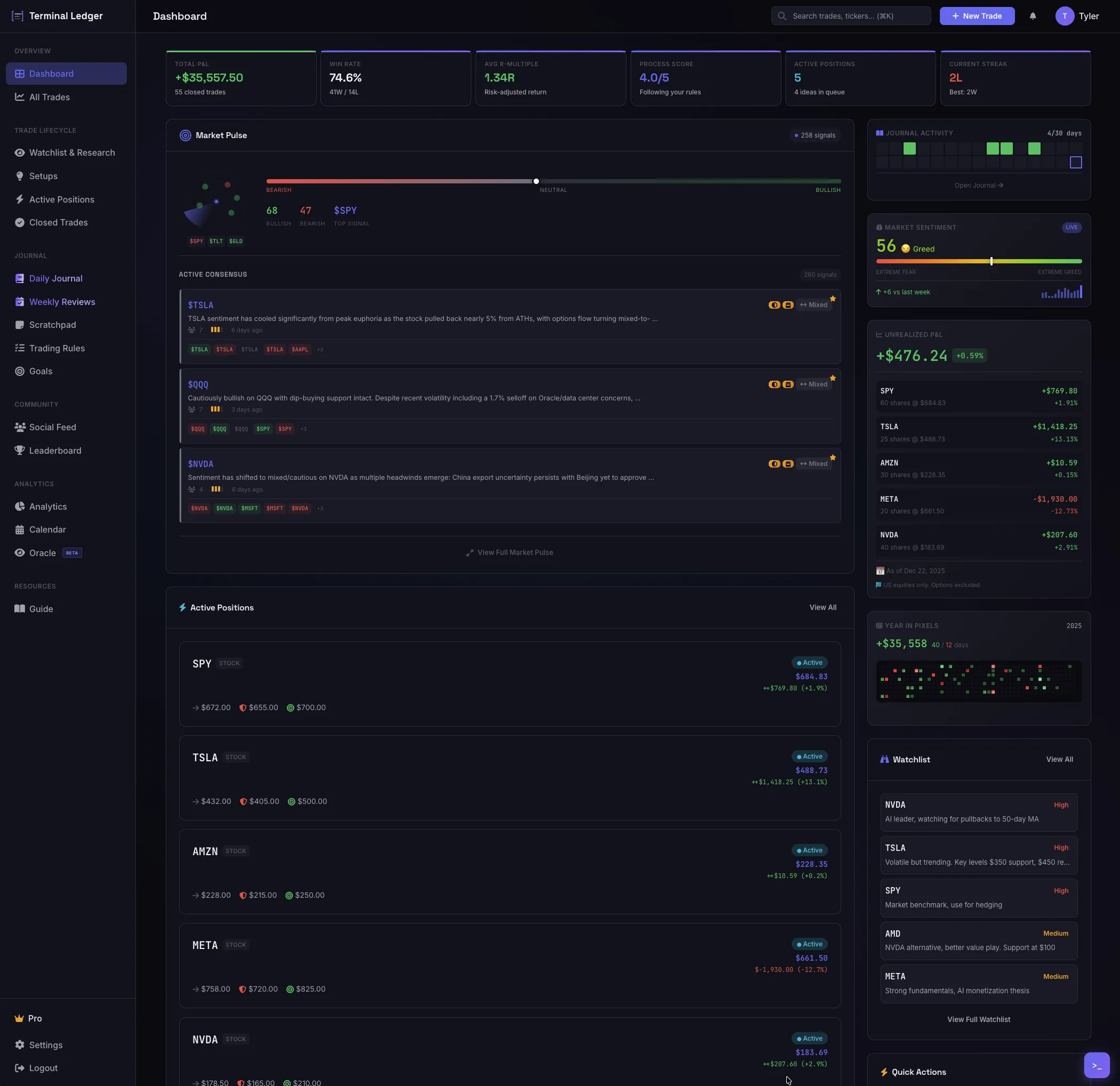 Terminal Ledger combines a professional trading journal with market research and intelligence tools. Track every trade, research with exclusive analytics, and build the discipline to become consistently profitable.